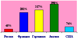 Например, активы действующего в России Citigroup составляют $1,5 трлн. — это в 4,5 раза больше, чем активы всей российской банковской системы. На фоне активов банковской системы Германии и Англии, составляющих свыше 300 % ВВП, наш рост с 30 % до 45 % за пять лет выглядит смешным. Правда, ради справедливости надо заметить, что для стран с особо высоким ВВП (США), этот показатель не так разительно отличается от российского. Однако, в абсолютных величинах расхождения, конечно, и здесь разительные.
