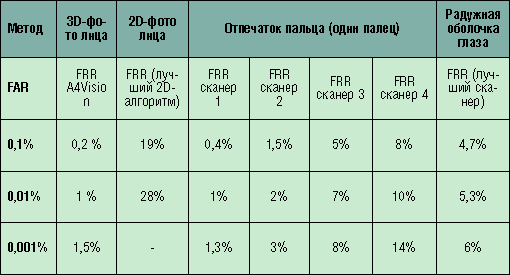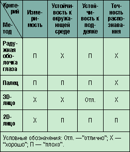 Системы распознавания по изображению лица могут работать с двумерным (2D-фото) или с трехмерным (3D-фото) изображением. Основными критериями оценки качества биометрических методов являются измеримость, устойчивость к окружающей среде, устойчивость к подделке, точность распознавания. Каждый метод имеет свои сильные и слабые стороны. Сравнительные характеристики биометрических методов Источник: НПО "Информация" Например, для распознавания по радужной оболочке глаза требуется ее изображение высокого разрешения. Из этого следует, что для точной идентификации человек должен располагаться по отношению к сканеру строго определенным образом, что неизбежно приводит к увеличению времени распознавания и повышению вероятности ложного нераспознавания (FRR). Кроме того, данная система может быть «обманута» фотографическим изображением “нужного” глаза, распечатанным с высоким разрешением или нанесенным на контактную линзу. Сложности в идентификации возникают также в случае расширения зрачка из-за усталости, болезни или применения медикаментов. Другой распространенный метод идентификации личности также в настоящее время не рассматривается в качестве основного в связи с возникающими сложностями при реализации. Распознавание по отпечатку пальца затруднено для работников физического труда, людей со слабо выраженными и стертыми папиллярными узорами, с дерматологическими дефектами, а также для пожилых людей с сухой кожей. Изображение поверхности пальца