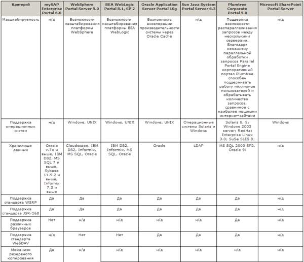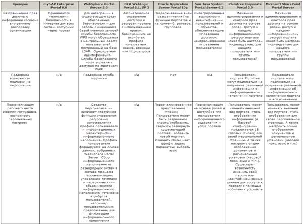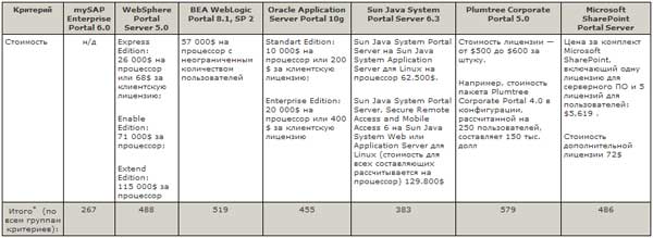 В сравнительном анализе портальных решений, проведенном компанией «РБК СОФТ», были рассмотрены основные платформы: Microsoft SharePoint Portal Server 2003, Oracle9iAS Portal, IBM WebSphere Portal, Sun Java System Portal Server, Plumtree Corporate Portal, BEA WebLogic Portal. Основные результаты представлены в сравнительной таблице ключевых критериев по следующим направлениям: функциональные требования, общие требования к архитектуре и требования к организационному обеспечению. Каждому приведенному в таблице критерию присвоен вес, определенный экспертами компании "РБК СОФТ". Итоговая оценка по каждой из групп критериев, приведенная в таблице, представляет собой среднее арифметическое значение и получена путем деления суммарного балла по данному критерию на число критериев. Функциональные требования Общие требования к архитектуре Требования к организационному обеспечению * Каждому приведенному в таблице критерию присвоен вес, определенный экспертами компании "РБК СОФТ". В строке "итого" после каждого подраздела таблицы приведены суммы баллов по всем критериям данного подраздела ("Функциональные требования", "Общие требования к архитектуре"). Итоговая оценка по каждой из групп критериев представляет собой среднее арифметическое значение (получена путем деления суммарного балла по данному критерию на число критериев). Источник: РБК СОФТ |