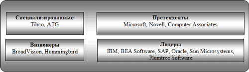 Конечные пользователи получат возможность создавать на портале сайты «по запросу» для обслуживания своих кратковременных узкоспециализированных потребностей. На этой же основе можно будет создавать порталы, поддерживающие работы проектных групп, а также контент-ориентированные микропорталы, порождаемые событиями. На основе этих требований, поставщики портальных платформ были разделены на четыре категории: нишевые игроки, «претенденты», «визионеры» и лидеры. Нас будет интересовать только последняя категория (и Microsoft). Категории игроков портального программного обеспечения Истоник: Gartner В группу лидеров входят компании IBM, BEA Systems, SAP, Oracle, Sun Microsystems и Plumtree Software. По мнению аналитиков Gartner Groups, разработки именно этих компаний наиболее полно реализуют функционал порталов. Базовый функционал порталов Применительно к вышеназванным портальным разработкам, можно выделить набор базовых функциональных возможностей, которые они обеспечивают. В первую очередь, это система управления массивом информации, входящая в состав корпоративного портала. С помощью данного сервиса информация портала систематизируется по структурированным каталогам, содержащим ссылки на контент. Механизм обеспечивает индексирование структурированной и неструктурированной информации. Сервис публикации дает возможность пользователям с соответствующими правами публиковать на портале свою информацию, пройдя, если нужно процедуру одобрения информации. При публикации материал учитывается в соответствующей категории хранилища документов и снабжается сопутствующей информацией, чтобы его можно было легко найти в случае необходимости. Публикация может быть автоматической или с помощью администратора портала. Обеспечение безопасности реализуется с помощью разграничения прав доступа к содержанию, согласно внутреннему распорядку компании, который включает: