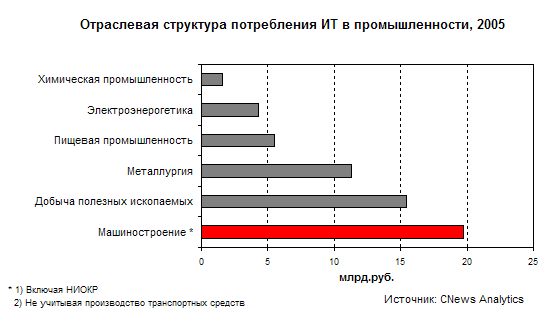* Индекс ИТ-емкости может быть интерпретирован как вклад информационных технологий в производство единицы продукции, а информационные технологии при таком подходе могут рассматриваться как один из факторов производства. Тот факт, что заводы, НПО и КБ активно осваивают новые формы конкурентоспособности в виде внедрения на своих производствах современных информационных систем, не отменяет острого системного кризиса, разворачивающегося в этом секторе экономики. Этот кризис имеет более глубокие причины, которые не могут быть преодолены за счет ИТ. Это, прежде всего, технологическая отсталость основных фондов предприятий. Однако технологическое перевооружение остается непосильной задачей практически для всех предприятий сектора. Рентабельность бизнеса машиностроительных предприятий неуклонно снижается — с 14,1% в 2000 году до 8,2% в 2004 году. Продолжает падать экспортный потенциал отрасли. Ее доля сектора в экспорте сокращается ежегодно на Относительно же высокий спрос предприятий машиностроения на ИТ не является в данном случае парадоксом или противоречием. Скорее всего, этот эффект достигается, Например, в настоящее время превышение кредиторской задолженности предприятий над дебиторской составляет около 95 млрд. руб. Если учесть, что машиностроение насчитывает порядка Тем не менее, если закрыть глаза на внутренние противоречия в развитии отрасли, то внешне все выглядит довольно благополучно. Отрасль демонстрирует классическую структуру потребления ИТ, в которой весьма гармонично сочетаются все основные статьи расходов — АО, ПО, услуги и обучение. Модальный тип потребителя ИТ в машиностроении остается все тем же — это предприятия-экспортеры вооружений, а также предприятия, включенные по линии военно-технического сотрудничества в систему субконтрактов. Сегодня вполне можно указать на еще один довольно тип активного потребителя ИТ, имеющего для этого и средства и мотивацию. Это в некотором роде антиподы экспортеров — предприятия, осуществляющие сборку высокотехнологичной техники либо по западным лицензиям, либо на основе импортируемых запчастей но под старыми советскими брендами (Рубин, Горизонт, Микромашина и др.). Такие предприятия, в строгом смысле слова не являющиеся отечественным высокотехнологичным производством (хотя де юро к таковому относятся), демонстрируют слишком хорошие показатели. Так, в телевизионном производстве в 2004 году объем выпуска телевизоров только в штуках вырос в 2 раза. То же касается отдельных видов бытовой техники, собираемой России из импортных запчастей. Напр., видеомагинтофонов в 2004 году было произведено почти в 8 раз больше. Объем производства ЭВМ вырос почти в 3 раза и т.д. Все эти предприятия — хорошие заказчики ИТ, так как часто они имеют не только западные технологии и деньги, но и западную мотивацию. Каковы же перспективы? На наш взгляд, они связаны исключительно с государственной политикой. И определенные продвижения здесь нельзя не отметить. Так, в прошлом году, 18 ноября Правительство РФ одобрило разработанную Мининформсвязи «Концепцию развития рынка информационных технологий в Российской Федерации», которая предусматривает введение двух очень мощных стимула развития спроса на ИТ со стороны предприятий — сокращение сроков амортизации АО и ПО, наряду с уменьшением налог