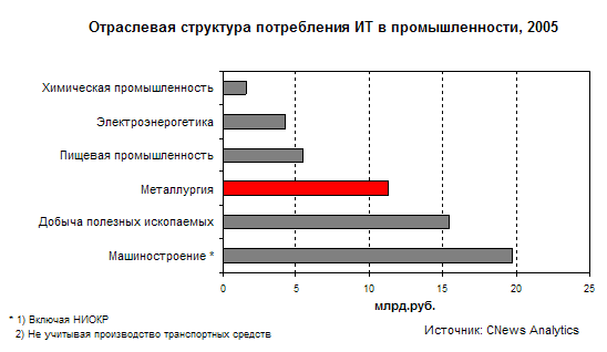 вынуждающий фактор, ввиду которого российская металлургия, скорее всего, никогда не выйдет из тройки отраслей-лидеров информатизации. Как и любая другая, замкнутая на экспорт, экономическая деятельность металлургия довольно прибыльна. Годовые обороты отечественных металлургических комбинатов составляют как минимум $3-5 млрд. Кроме того, металлургические холдинги имеют достаточно сложную инфраструктуру деятельности. Все три фактора делают металлургические предприятия одними из самых крупных заказчиков дорогостоящих информационных систем.