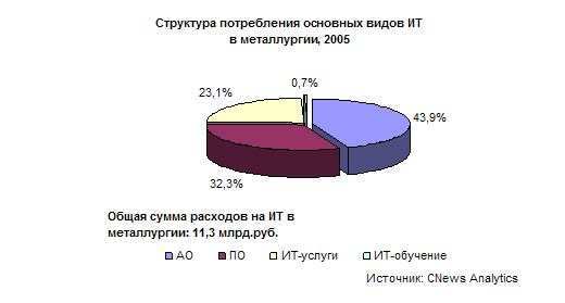 Анализ структуры потребления основных видов ИТ в металлургии указывает на два нетипичных для зрелых отраслей феномена. Во-первых, это необычно высокая доля затрат на чистые ИТ-услуги — аудит и консалтинг, которая, по нашим оценкам, в 2005 году составила около 23% (всего порядка 2,5 млрд.руб.), вместо типичных 13-15%. Во-вторых, это четко зафиксированная статистикой неустойчивость поведение отрасли на рынке ИТ в 2003-2004 гг.