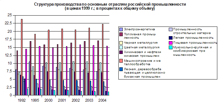 Интересно, что общая структура производства в российской промышленности не претерпела кардинальных изменений с 1992 года, несмотря на существенные изменения в его объёмах по отраслям. Доля машиностроения и металлообработки по сравнению с 1992 годом снизилась на 6,7%, напротив, доля топливной промышленности выросла на 22%, доля пищевой промышленности — на 6%, цветной металлургии — на 41%, чёрной металлургии — на 22,4%, химической и нефтехимической промышленности — на 12,5%. Доля лесной и деревообрабатывающей промышленности сократилась на 27%, легкой промышленности — на 73%, промышленности стройматериалов — на 34% и мукомольно-крупяной — на 42,8%.