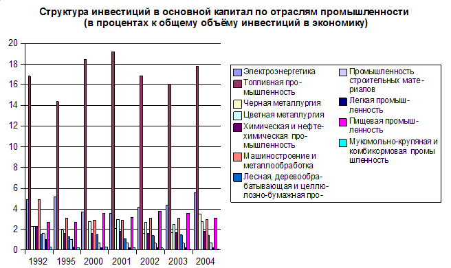 Что касается распределения инвестиций по отраслям промышленности, то значительная их часть продолжает направляться в топливную промышленность (17,8%) и электроэнергетику (5,6%), вложения же в машиностроительную и металлообрабатывающую промышленность (3%) сопоставимы с вложениями в чёрную (3,5%) и цветную металлургию (2,8%), а также в пищевую промышленность (3,1%). Такое распределение объясняет рост доли топливной промышленности, цветной и чёрной металлургии в общем объёме производства отрасли. Если же вспомнить, что предприятий топливной промышленности насчитывается 1700, цветной металлургии — 1900, чёрной металлургии — 1200, а в машиностроении и металлобработке задействовано порядка 45000 предприятий, то становятся ясны причины замедления роста производства в машиностроении, а также перспективы его дальнейшего спада, если структура инвестиций в ближайшее время не изменится.