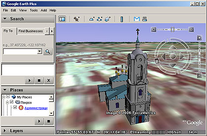 Разрешение задачи стало возможным благодаря переходу от использования бумажных карт к электронным. Если в первом случае измерения на карте производятся обычно с использованием механических инструментов линеек, курвиметров, циркулей, то переход к картам электронным позволил интегрировать средства измерения в сам цифровой продукт, а все операции производить с помощью «мышки» или иного, но столь же удобного интерфейса. Это позволило расширить спектр географических проекций, используемых для отображения географической информации на экране, и начать переход к использованию для «фиксации» объектов так называемых географических систем координат широты, долготы и высоты «над уровнем моря». В этом случае их проекция на компьютерный «экран» осуществляется «на лету» и может быть, строго говоря, произвольной. Цифровая модель церкви в интерфейсе Google Earth