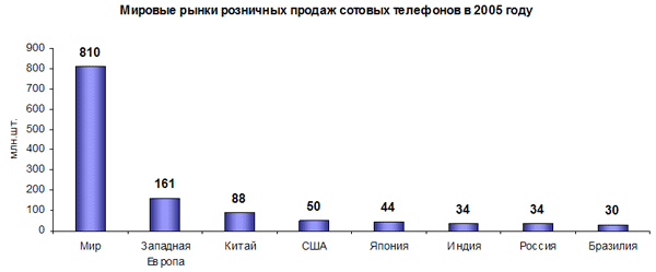 Источник: IDC, 2005 Региональная специфика Продажи мобильников в различных регионах мира имели свою специфику. Например, западноевропейские и североамериканские абоненты оказались более активными в плане замены своих старых моделей на новые, а развивающиеся рынки росли за счет новых подписчиков. Причем именно развивающиеся страны служат основным источником новых абонентов, и эта тенденция сохранится в ближайшие годы. Потенциал рынка остается высоким — в мире число абонентов мобильной связи должно превысить в 2006 году 2 млрд., в то время как в 2004 году их было 1,7 млрд.; к 2010 году прогнозируется, что число абонентов достигнет 2,7 млрд. Источник: Евросеть, 2005 Самый большой объем продаж мобильников ожидается в Nokia ожидает от рынка Китая большого увеличения продаж, как одного из наиболее развивающихся. По прогнозам компании, Китай к 2010 году увеличит количество мобильных пользователей на 250 млн. человек. Сейчас в этой стране насчитывается 380 млн. сотовых абонентов. За первые 9 месяцев 2005 года Nokia продала на рынке Китая и Тайваня около 23 млн. трубок. В Латинской Америке объем продаж мобильных телефонов в 2004 году почти удвоился, а к 2009 году может достичь отметки 100 млн. штук в год. Европейский рынок мобильников показывает устойчивый рост, который обеспечивается, главным образом, обилием технологических новинок. Лидирующим регионом по выпуску новых устройств в 3 квартале 2005 года, как и в предыдущих кварталах, стала Западная Европа. Но по прогнозам исследователей, к 2008 году темпы роста в этом регионе существенно замедлятся. Это связывают с тем, что к тому времени производители смогут удовлетворить здесь высокий спрос на новые модели. Виталий Солонин / CNews Analytics Павел Караулов: После «августовского кризиса» розничные цены на мобильные телефоны выросли на