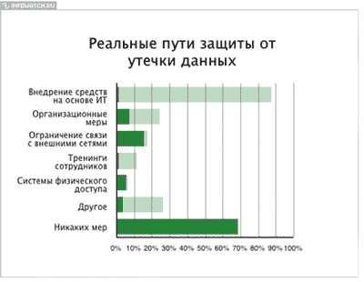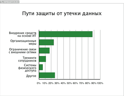 Объяснение на удивление низкого уровня использования технических средств и организационных мер состоит преимущественно в том, что на рынке отсутствуют специализированные технологические решения. Эту причину указало более половины (58%) опрошенных компаний. Что же до бюджетных ограничений, являющихся наиболее распространенным препятствием на пути внедрения информационных технологий в целом, то эта причина набрала лишь 19% голосов опрошенных. В то же время остальные трудности (нехватка персонала, юридические препятствия, отсутствие стандартов) присутствовали в результатах опроса эпизодически. Таким образом, российский бизнес полностью уверен в отсутствии технологических решений для защиты от внутренних угроз в общей сложности и утечки секретных данных, в частности.