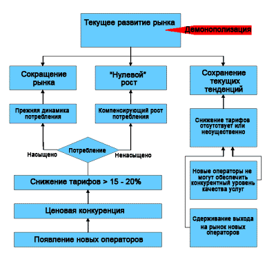 Естественно, в данном случае речь идет не об устойчивом, продолжающемся бесконечно долго уменьшении объемов рынка, а лишь о кратковременном их снижении, вызванном падением тарифов на услуги связи при отсутствии компенсирующего роста потребления подешевевших услуг.