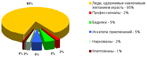 Администрация «прорабатывает» гибкие бизнес-процессы, продавцы «не доносят» товар до прилавков, грузчики «ошибаются» машиной при погрузке. В общем, воруют все. Показательно, что 10 % работников идут в торговлю с четко обозначенной целью — воровать. Из оставшихся 90 % ни при каких обстоятельствах не будут воровать только 10 %, а 80 % работников украдут, если представится такая возможность.