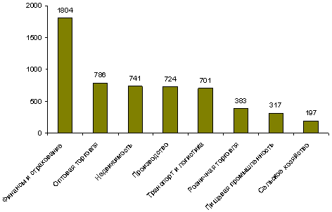 Лидером по затратам являются предприятия из финансового и страхового сектора — они расходуют в среднем более $1800 в месяц. Далее следуют оптовая торговля ($786), недвижимость, аренда и лизинг ($741), производственные предприятия ($724),транспорт и логистика ($701). Розничная торговля попала в аутсайдеры — здесь тратят ниже среднего — $383. Замыкают список пищевая промышленность ($317) и сельское хозяйство ($197).