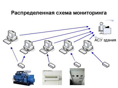 В случае распределенной схемы для каждого вида оборудования создается рабочее место по мониторингу, но при этом теряется общность в оценке состояния оборудования, информация располагается на различных компьютерах.