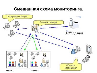 Наиболее гибкой является смешанная схема мониторинга, которая строится по иерархическому принципу. Для группы оборудования, которая выделяется либо по функциональному, административному, либо по географическому признакам, устанавливается одна или несколько станций мониторинга. При этом одна станция выступает в качестве главной станции для этой группы, а остальные — в качестве дополнительных. В случае выхода из строя главной станции, её функции передаются одной из дополнительных станций в соответствии с заданным приоритетом.